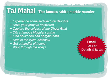 Taj Mahal is the most well preserved and architecturally beautiful tomb in the world. It is studded with precious stones. In the basement is the tomb of Mumtaz Mahal and the tomb of Shah Jehan. The emperor had intended that a Black Taj be built across the Jamuna where his body would be kept. However his son Emperor Aurangzeb, who imprisoned his father in Agra Fort and took over the throne, buried him alongside of Mumtaz. Tourists from all over the world and even State Guests make it a point to be photographed at the Taj. Also close by is the famous Agra Fort. So exquisite is the workmanship that the Taj has been described as "having been designed by giants and finished by jewelers".